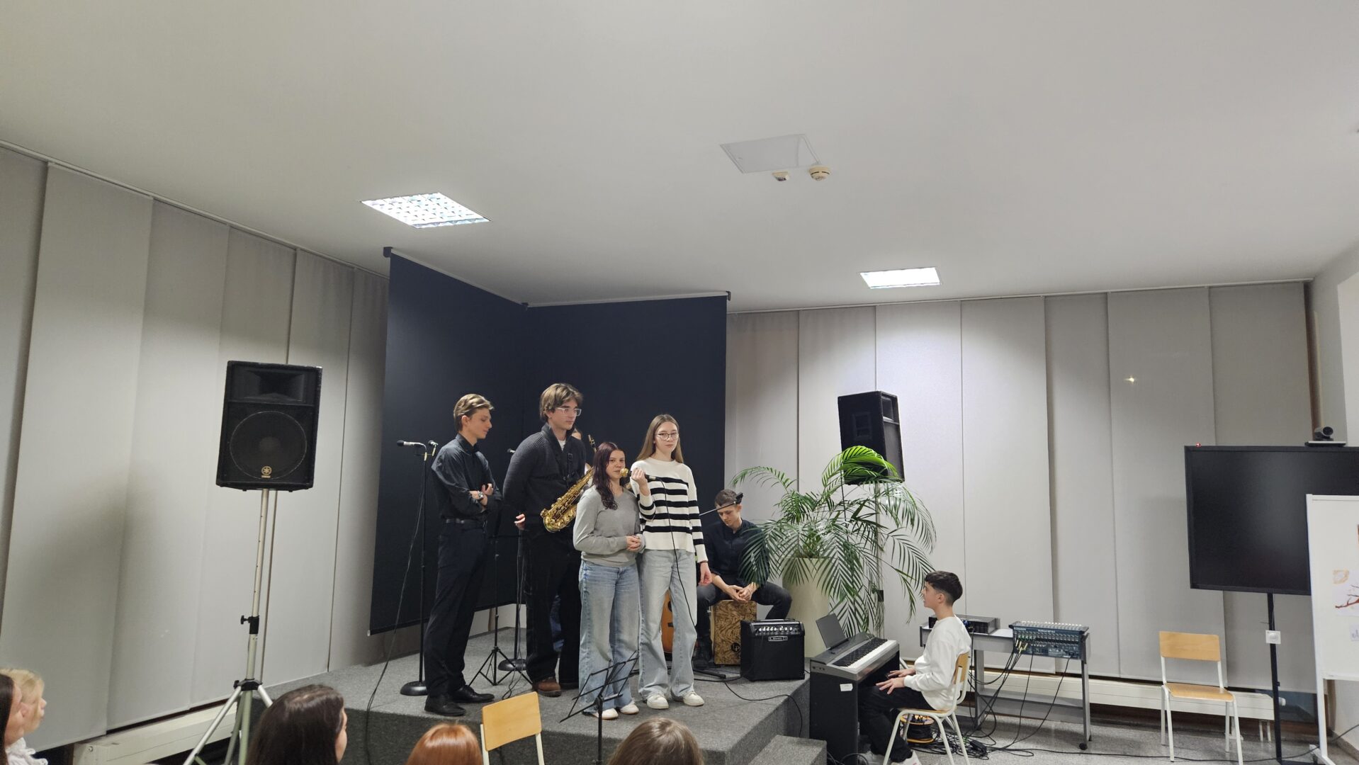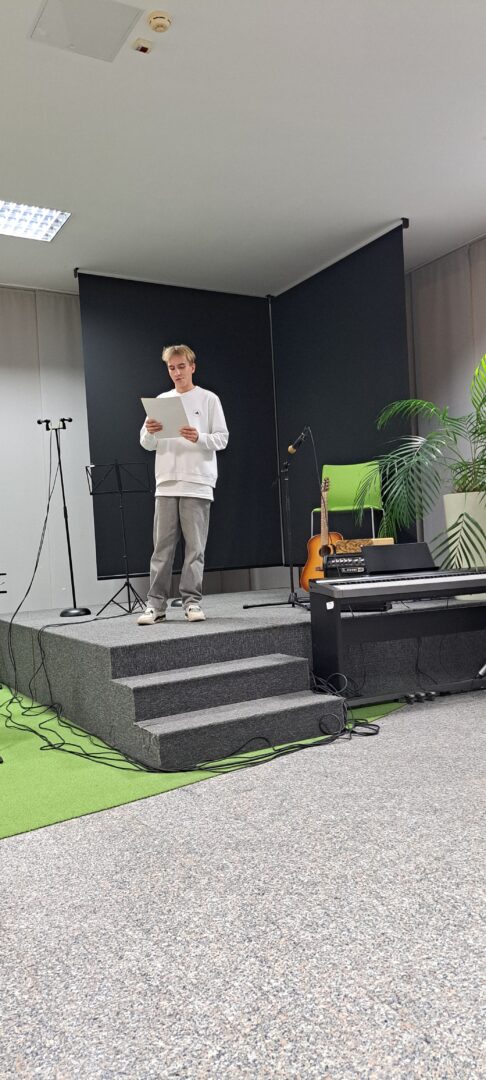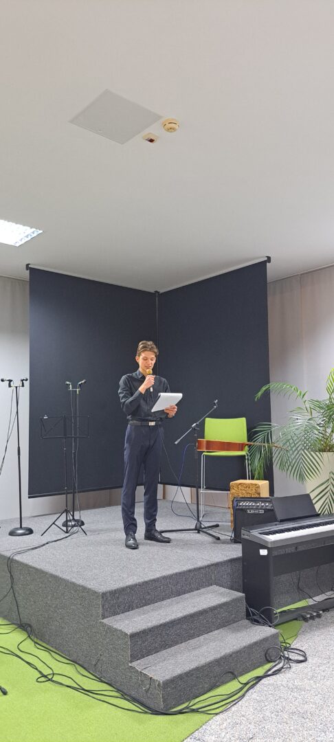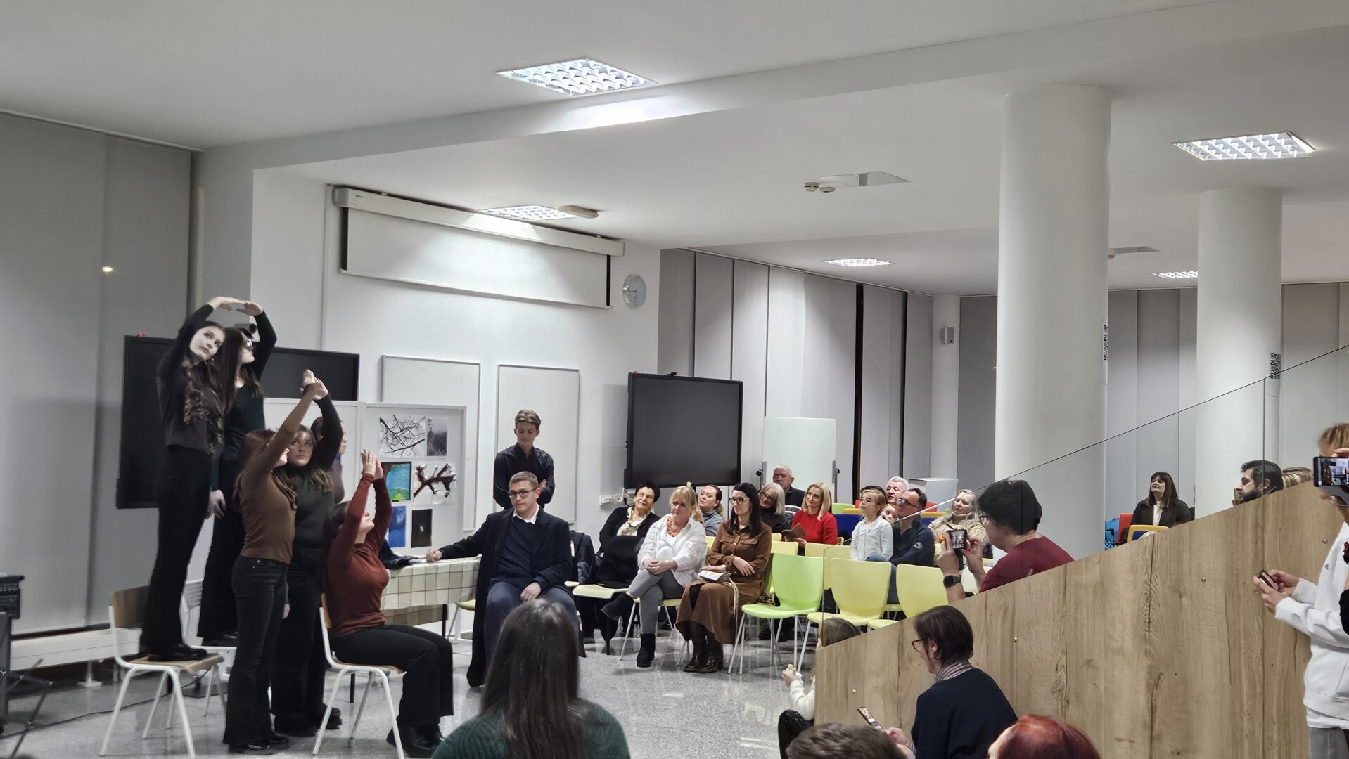 Prostor Prve gimnazije Varaždin 27. studenoga 2025. bio je ispunjen radošću i snažnim sjećanjem na velikoga barda hrvatske književnosti. Uz profesorice Slavicu Kelemen, Tatjanu Ruža i Ivu Pintarić Mandić, podršku u slaganju i povezivanju raznovrsnog programa dale su i profesorice Ksenija Mađarić, Ivana Pintarić i Sanja Horvatić. „Večer Tina Ujevića“ pokazala je snagu suradnje, kreativnosti i interdisciplinarnog pristupa te potvrdila da je projekt „Kulturaonica“ vrijedan doprinos kulturnom i umjetničkom životu škole i šire zajednice.