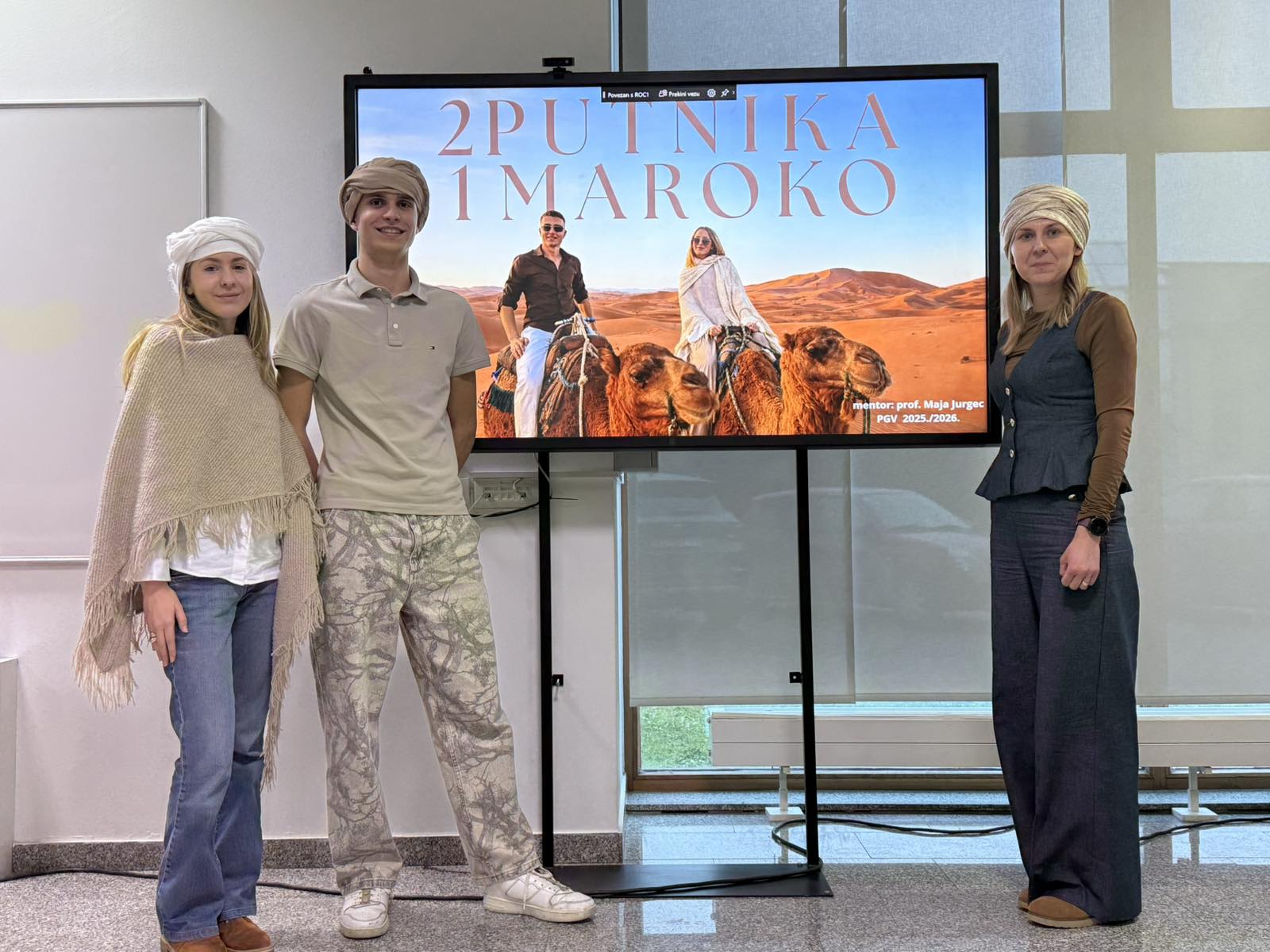 Marakesh, Rabat, Fez, Casablanca, Chefchaouen, pustinje Agafay i Merzouga samo su neke od destinacija o kojima smo imali prilike slušati u četvrtak, 29. siječnja 2026. u prostorima ROC-a. Putnici Sara Makar i Andrej Martinez podijeli su zainteresiranim učenicima i djelatnicima škole doživljena iskustva na putovanju u Kraljevinu Maroko. Običaji, gastronomija, najčešće riječi i rečenice iz te afričke države na trenutak su nas prebacile na drugi kontinent, u puno toplije krajeve u kojima su Sara i Andrej imali prilike vidjeti i dodir pustinje i snježnih obronaka. Velika hvala našim maturantima što nesebično dijele svoja iskustva!