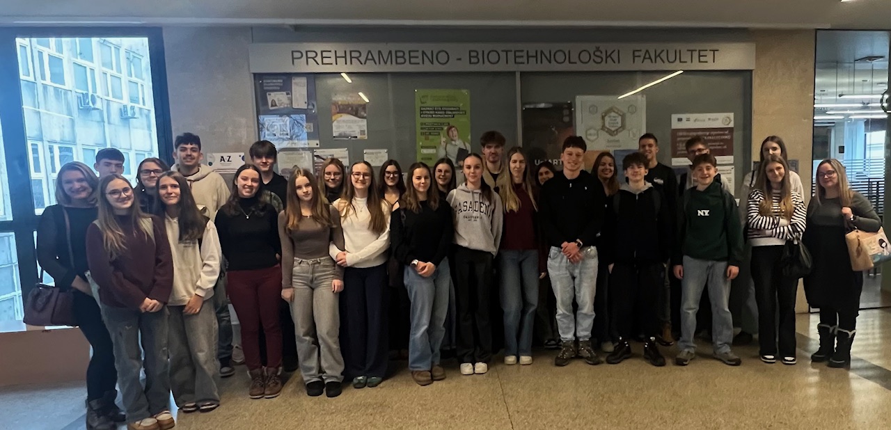 U petak, 20. veljače, učenici Prve gimnazije Varaždin posjetili su Prehrambeno-biotehnološki fakultet u sklopu projekta „Biokemija zdrave prehrane: Eksperimentalni pristup analizi namirnica i razvoju nutritivnih smjernica”. Učenike su tijekom posjeta pratile nastavnice Tihana Čus Slatković i Lidija Klampfl.