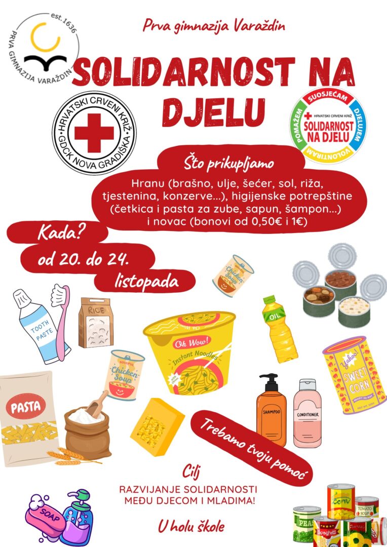 Akciju ćemo u našoj školi provoditi od 20. do 24. listopada 2025., a sve donacije možete donijeti u školski hol gdje će biti postavljene kutije za namirnice i higijenske potrepštine, te kasica za novčane priloge.