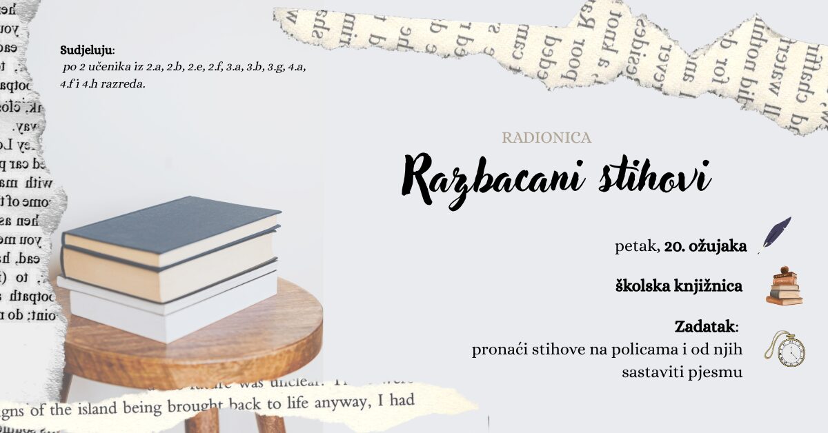 U petak, 20. ožujka održat će se radionica Razbacani stihovi povodom Svjetskog dana poezije. Sudionici će dobiti zadatak da pronađu razbacane stihove koji se nalaze na policama knjižnice i od njih sastave originalnu pjesmu. Na radionici će sudjelovati po dva učenika iz 2. a, 2. b, 2. e, 2. f, 3. a, 3. b, 3. g, 4. a, 4. f i 4. h razreda.